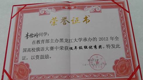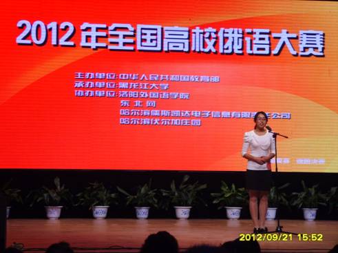 由教育部主办,黑龙江大学承办的2012年全国高校俄语大赛于9月20日——23日在黑龙江大学隆重举行。永利官网俄语系共派出3名学生参加了这次大赛。其中李怡玲同学在初赛中脱颖而出,进入前20名,从而取得了复赛权,并获得本次大赛的优秀奖。这是永利官网俄语专业学生在全国高校俄语大赛中首次进入复赛,实现了零的突破。。