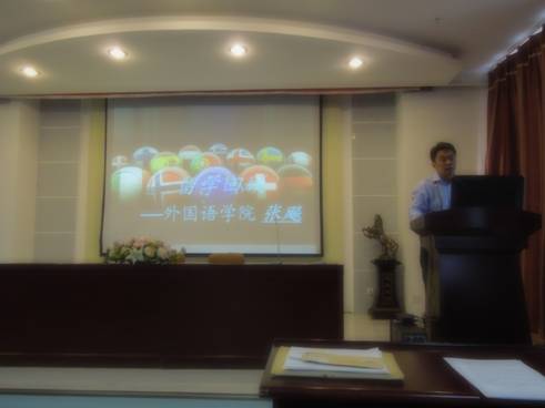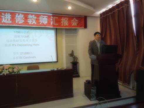 首先是岳喜华副院长介绍了美国路易斯维尔大学的教学方法和课程设置,以及他在进修期间的收获和体会,他表示此次进修让他进一步深入了解了英语语言与文化,尤其是加强了对隐喻和文化的专题研究,丰富了人生阅历,学习到了新的教学方法。接下来是徐健老师介绍她在帝国理工大学进修的学习体会,通过对翻译方面课程的研修和参加的一些学术讲座,使徐健老师对英国文化有了更多的了解。薄红昕老师介绍了她在首都大学东京学习和生活的经历,日本人的治学严谨、对秩序和规定的严格遵守都给她留下了深刻的印象。张飚老师介绍了英国雷丁大学的概况、课程设置和科研情况,通过他居住的三个家和接触到的三个房东向大家生动地介绍了他眼中的英国文化。