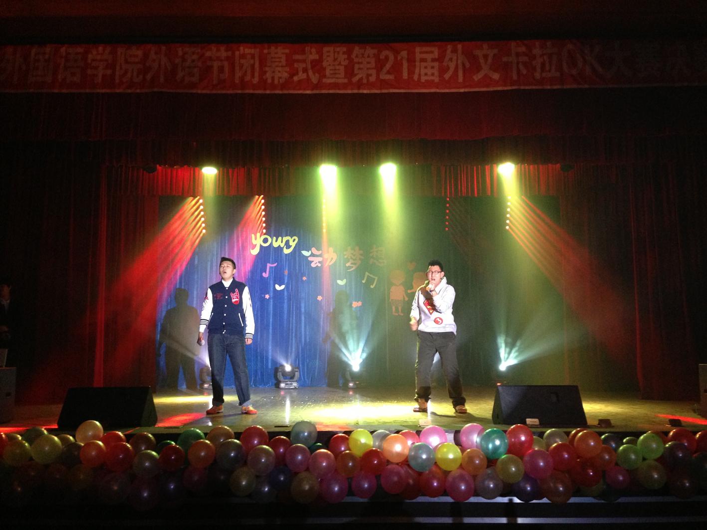 2013年12月9日18时30分,由304永利登录入口举办的以“young动梦想”为主题的第二十一届外语节闭幕式暨外文卡拉OK大赛决赛在小礼堂顺利举行。304永利登录入口党委副书记、副院长郭永长老师,英语系教研室主任赵莉老师,日语系教研室主任王佳音老师,俄语系教研室副主任车琳老师,院团委书记、2011级政治辅导员郭林老师,2012级政治辅导员李婧坤老师,2013级政治辅导员袁野老师,校学生会、各学院学生会代表和各学院学生亲友团莅临本次晚会。生命科学学院团委宋天宇老师、304永利登录入口外籍教师Lindsey、Tom、Heather、千叶真子等出席本次比赛并担任评委。