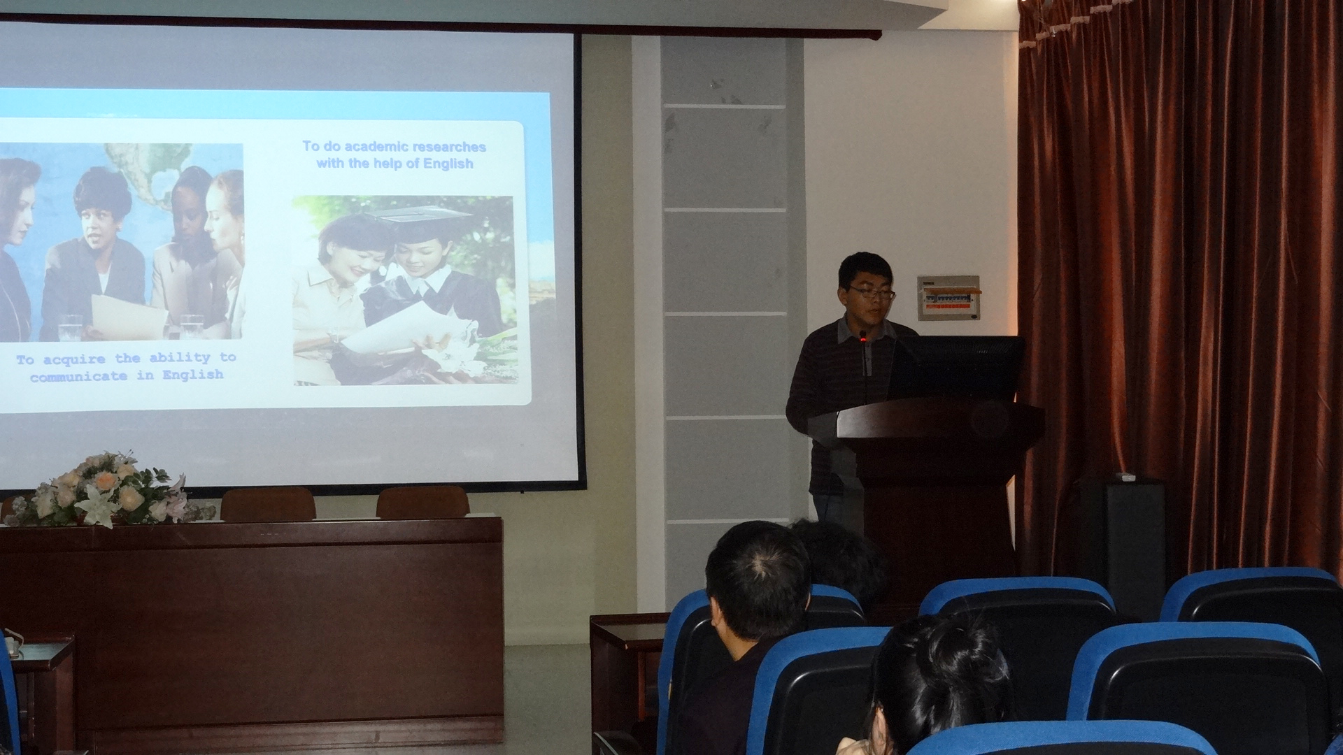 本次活动由获2013年东北林业大学青年教师授课大赛一等奖的吴晶老师为大家展示了他对大学英语第一节课的教学设计。首先展示问候语及自我介绍环节,接下来他从教材特点、学习时间分配、评价方式、自主学习网络平台以及第二课堂活动等几个方面全方位向学生展示了大学英语课程的内容和特点,然后他又引领学生畅想对大学英语课程的期待,引导学生讨论大学英语与高中学习的不同,充分调动了学生积极参与的热情。最后他又将学生分成小组做自我介绍,小组代表汇报完成之后他又设计了纠正发音的环节。吴晶老师的“第一节课”课堂教学设计合理,呈现清晰。