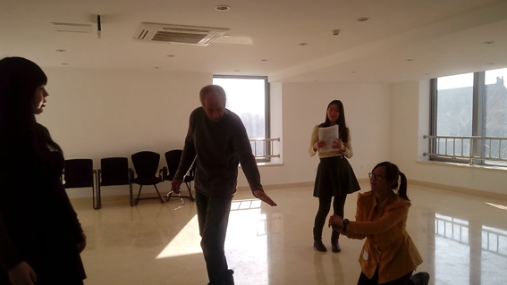 此次大师班是香港中文大学英语系及艺术行政办公室为 “第十届中国大学莎剧比赛”举办的培训项目,北京地区共26所院校参加,包括中国人民大学、浙江大学、南京大学等一流院校。培训期间,主办方邀请了美国百老汇著名戏剧家Joe Graves 及舞台剧演员Liz。Joe Graves毕业于伦敦艺术表演学院,现任北京大学外国戏剧与电影研究所艺术总监,已在美国、英国和中国导演过近五十部古今话剧、音乐剧和歌剧,饰演过100多个话剧角色。他向选手们示范如何将台词与舞台表演艺术有机结合,如何将作家的创作意图、人物性格充分传达给观众,并专门就语音、语调、重音等问题给予了重点指导。我院代表队极为珍惜这次机会,认真学习,虚心听取专家意见,针对参赛作品反复排练。学生们表示,从Graves先生身上我们看到的是一种对戏剧的极大热爱,对表演的极度热情,看Joe 的演绎很容易爱上艰涩难懂的莎剧,此行不但加深了对莎剧的感情,同时亦增加了演好莎剧的信心。