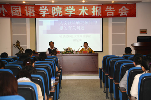 2014年10月8日下午1点40,哈尔滨师范大学西语学院田延明教授在文博楼1019室作了题为“人文社科研究项目申报的有关问题”的报告。报告会由孙爽副院长主持,304永利登录入口全体老师和部分硕士研究生聆听了此次报告。