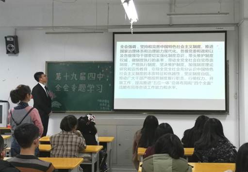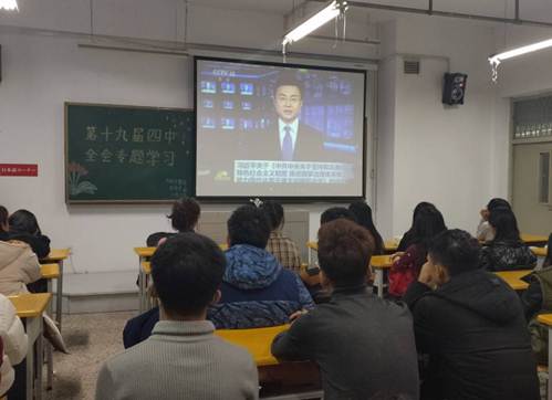各班级通过集体收看十九届四中全会的实况回放,深入解读党的十九届四中全会的历史背景和根本任务,并针对其内容进行具体解读和广泛学习。学习思考全会通过的方针政策以及会议上习近平总书记的重要讲话,结合大学生的实际情况,加以分析,并发表个人学习心得与看法。各班学习热情高涨,学习态度认真,均取得了良好的学习效果。