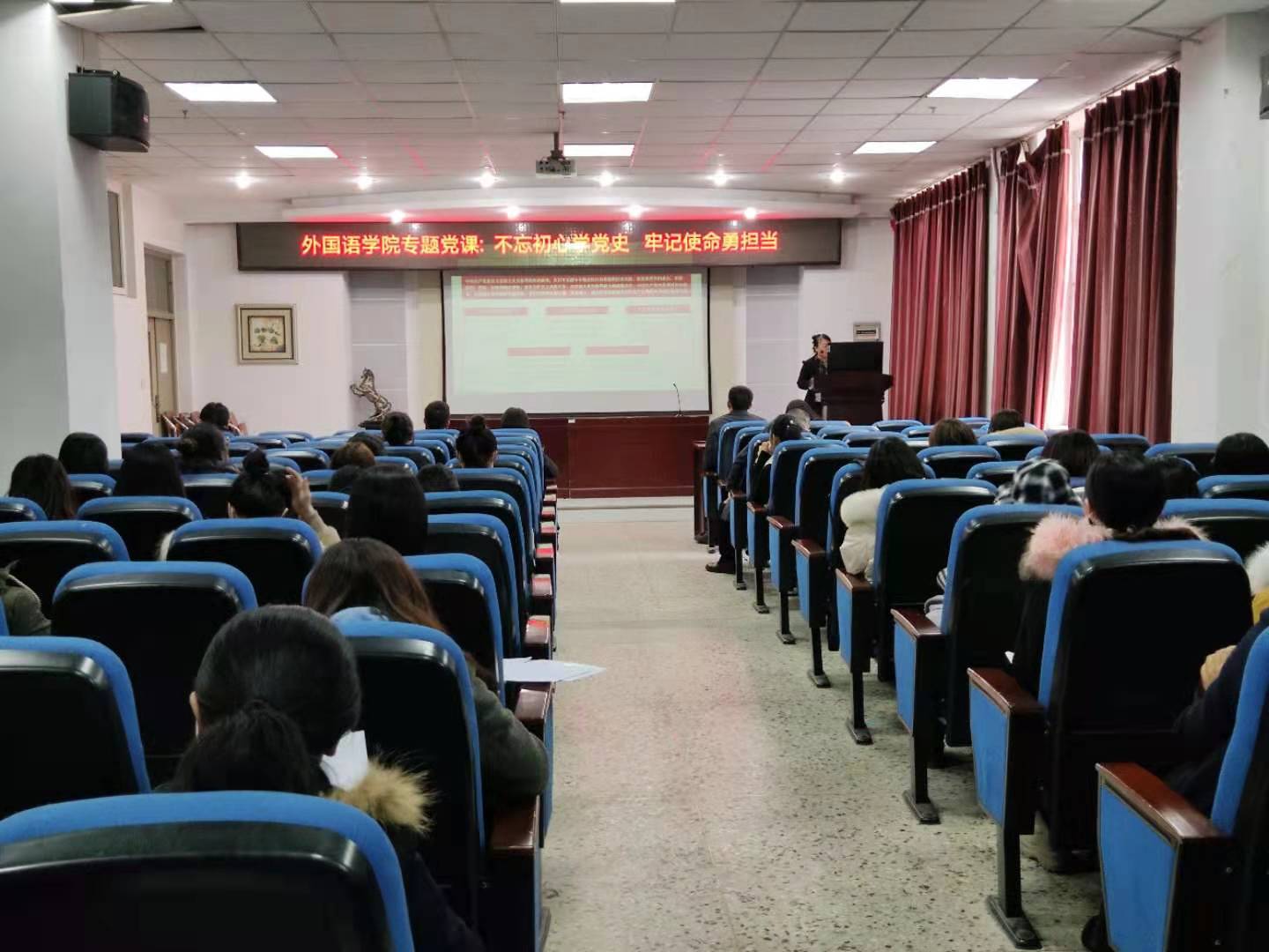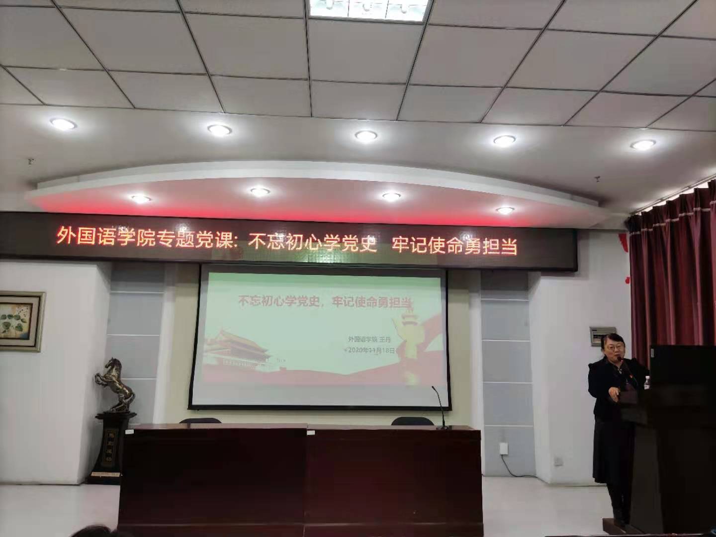 11月18日,304永利登录入口于文博楼1019进行“不忘初心学党史、牢记使命勇担当”专题党课学习,由304永利登录入口党委书记王丹主讲。参加党课的有全体教工党员及学生党员代表,共百余人。