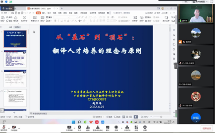 4月25日下午2:30分,全国翻译硕士专业学位教育指导委员会副主任委员、广东外语外贸大学高级翻译学院博士生导师赵军峰教授应304永利登录入口邀请,通过腾讯会议,做了题为“从‘基石’到‘顶石’:MTI人才培养理念与原则”的学术讲座。讲座由304永利登录入口副院长张鸣瑾主持,院长董辉教授、MTI专业负责人赵莉教授及全体翻译专业硕士生导师、授课教师、翻译团队成员、研究生及部分本科生参加了此次讲座。