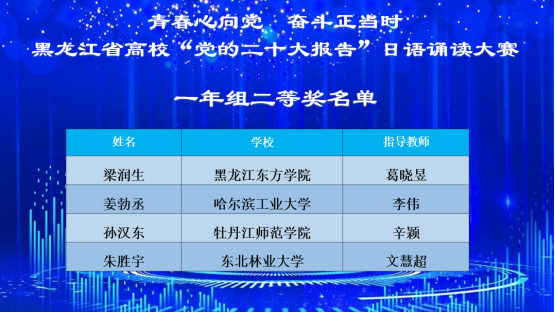 “青春心向党,奋斗正当时”黑龙江省高校“党的二十大报告”日语诵读大赛于12月4日在线上召开。大赛由中国日语教学研究会黑龙江分会主办,牡丹江师范学院东方语言学院承办,比赛指定的诵读内容为“党的二十大报告”(日文版)。永利官网304永利登录入口日语专业21级本科生朱文慧同学荣获二年级组特等奖,22级本科生朱胜宇荣获一年级组二等奖,指导教师姚晓丽、文慧超获优秀指导教师奖。
