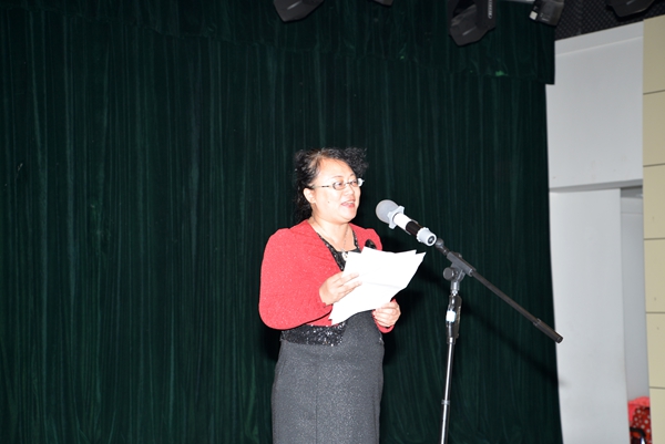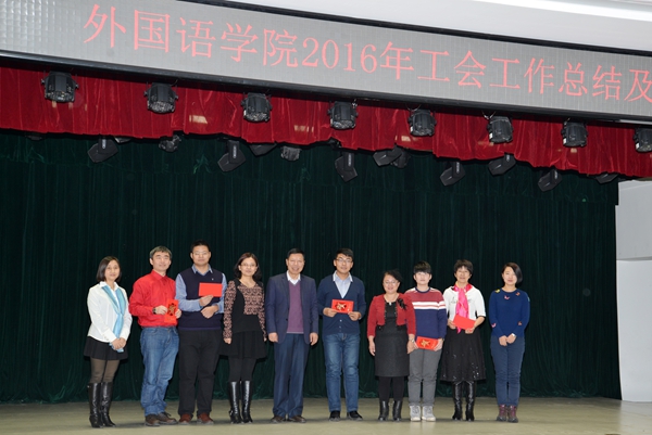 活动开篇,王丹院长以简短精辟的语言对学院2016年度工作予以概括,对2017年度的教学、科研、研究生教育、学生就业等方面提出了希望。伴随着圣诞音乐的响起,联欢会在英语系外教的动人歌声中正式拉开帷幕。随后,俄语系教师为大家带来了《拍手舞》,大家在阵阵律动中感受着阳光、欢快。“北国风光,千里冰封,万里雪飘”,日语系文惠超老师的散文朗诵《春》娓娓道来,哪怕是在炎炎冬日,也如同沐浴在春日的阳光之下。而接下来俄语系的歌伴舞《红梅花儿开》和张懿老师的男声独唱《我的太阳》风格各异,前者温婉动人,后者情感热烈,在场的观众们也为之感动。歌美舞美,当然也少不了由机关工会小组表演的三句半——《外语这一年》。“生活就像一团麻,有苦有甜有风沙,只要我们一条心,没事没事”,三句半的顺利演出将联欢会的气氛推向了高潮。随后,总结和联欢会进入工会活动“年度优胜奖”的颁奖环节,由工会主席陈志伟同志宣读了2016年度工会文体活动成绩,各系部室代表上台领奖,一张张证书印证的正是教工们团结一致的凝聚力。接着,王丹院长和杨滨章书记为大家带来了婉转悠扬的二重唱《东方之珠》,歌曲博得了全场热烈的掌声。随后,英语专业全体老师为大家献上《亲亲我的宝贝》,在温暖的歌声中大家仿佛回到了童年的故乡。接下来是由袁野、风间隼、吴晶、马沛虹等实力唱将先后演唱了《情歌》、《每天爱你多一些》、《告白气球》等流行歌曲和赵萌、朱曼、孙瑞朗诵的英文诗《当你老了》。相声表演《聊爱好》在众多节目中应该是最引人注目的了,祁玉龙和张懿两位老师融工作生活于一体,言语幽默风趣,台下观众忍俊不止,场内气氛再度达到高潮。《新年如童话般降临》正是我们的心愿,俄语系外教用自己动人的歌声为大家许下了一个个美好的新年愿望。“有福就该同享,有难必然同当,用相知相守换地久天长”,活动尾声行政和电教工会小组的全体人员为大家带来了《相亲相爱一家人》。最后,总结和联欢会在杨书记总结致辞中落下帷幕。