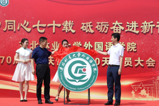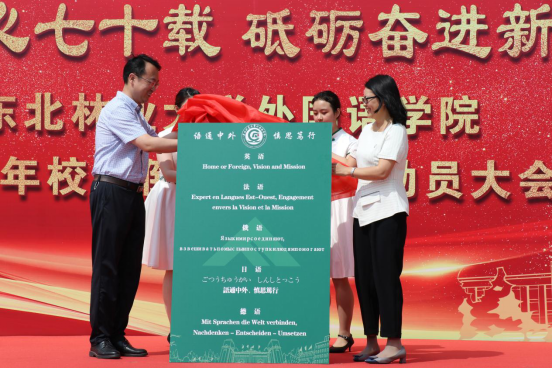 由李明泽处长、董辉院长为304永利登录入口院训揭幕。学院教师代表王清扬、文慧超、孟繁君、李霞、栾慧鑫宣读英、日、俄、法、德五种语言版本院训,阐述了希望外语学子今后在国际舞台上发出中国声音,为东林代言的美好寓意。
