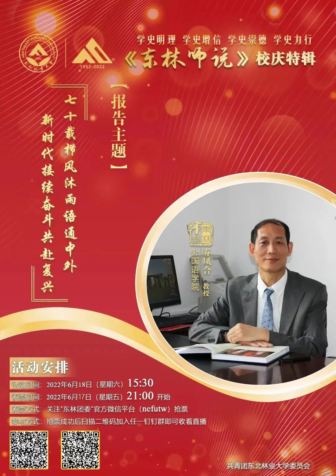 2022年6月18日下午,乔凤合教授受邀做客第三十六期《东林师说》,以“七十载栉风沐雨语通中外,新时代接续奋斗共赴复兴”为主题,回望东林光辉历史,展望东林学子未来发展之路。