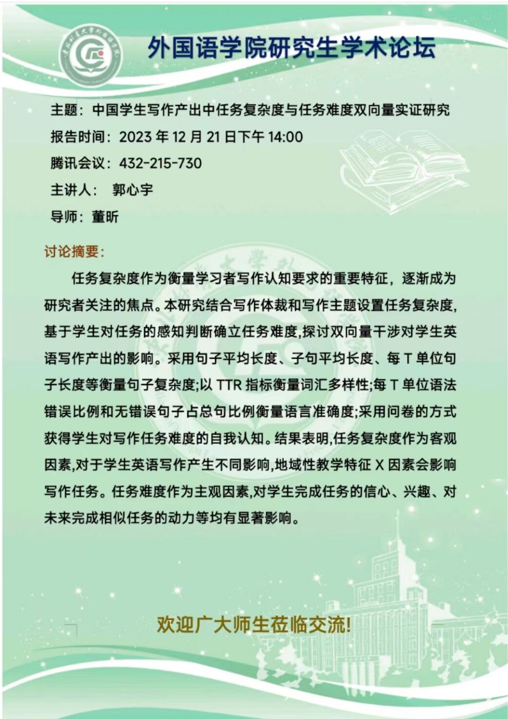 304永利登录入口研究生学术论坛——中国学生写作产出中任务复杂度与任务难度双向量实证研究